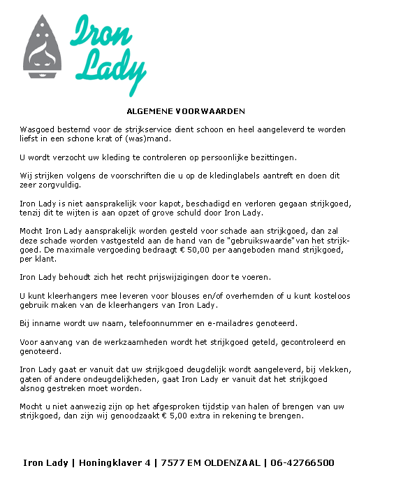 Heb je een hekel aan strijken of heb je er door een drukke baan of gezin gewoon geen tijd voor? Moet je er voor je werk toch elke dag representatief uitzien? Is het strijken van kleding een te belastende bezigheid voor je? Ik kan iedereen in de regio Oldenzaal/Enschede daarin een helpende hand bieden! Iron Lady zorgt met liefde voor je kleding. Ik haal het strijkwerk thuis of op je werkadres op en breng het op de met jou afgesproken tijd weer kreukloos en fris gestreken bij je terug. Bij mij thuis afleveren aan de Honingklaver 4 kan natuurlijk ook.